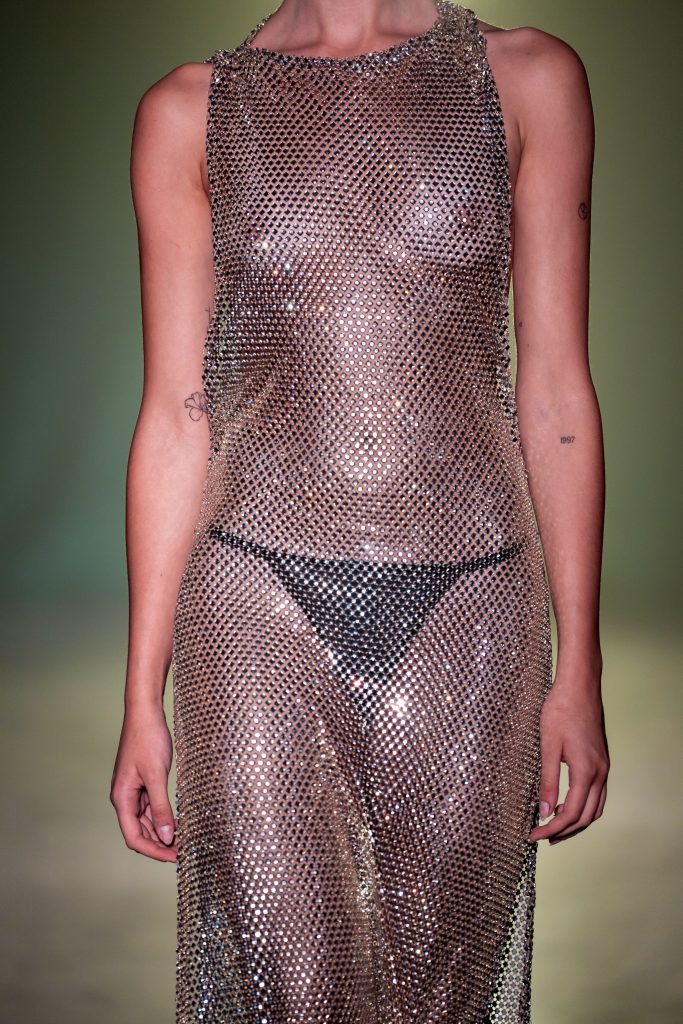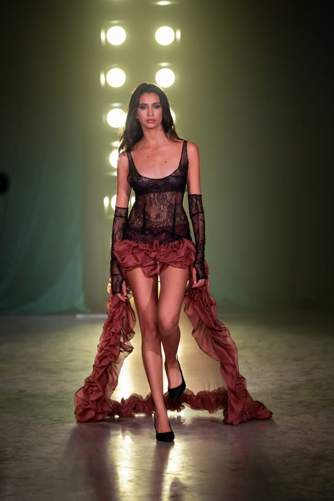En pasarela, el cuero, la gasa de seda natural, las transparencias, el volumen y los brillos fueron protagonistas, creando un diálogo entre lo estructurado y lo etéreo.