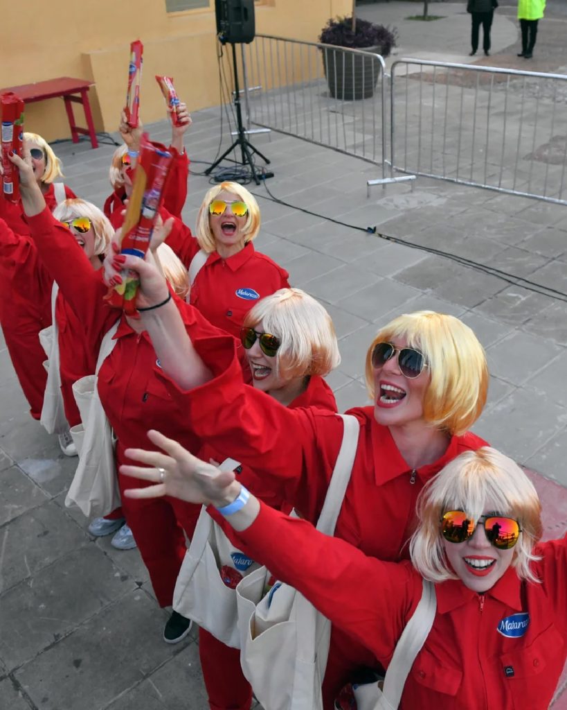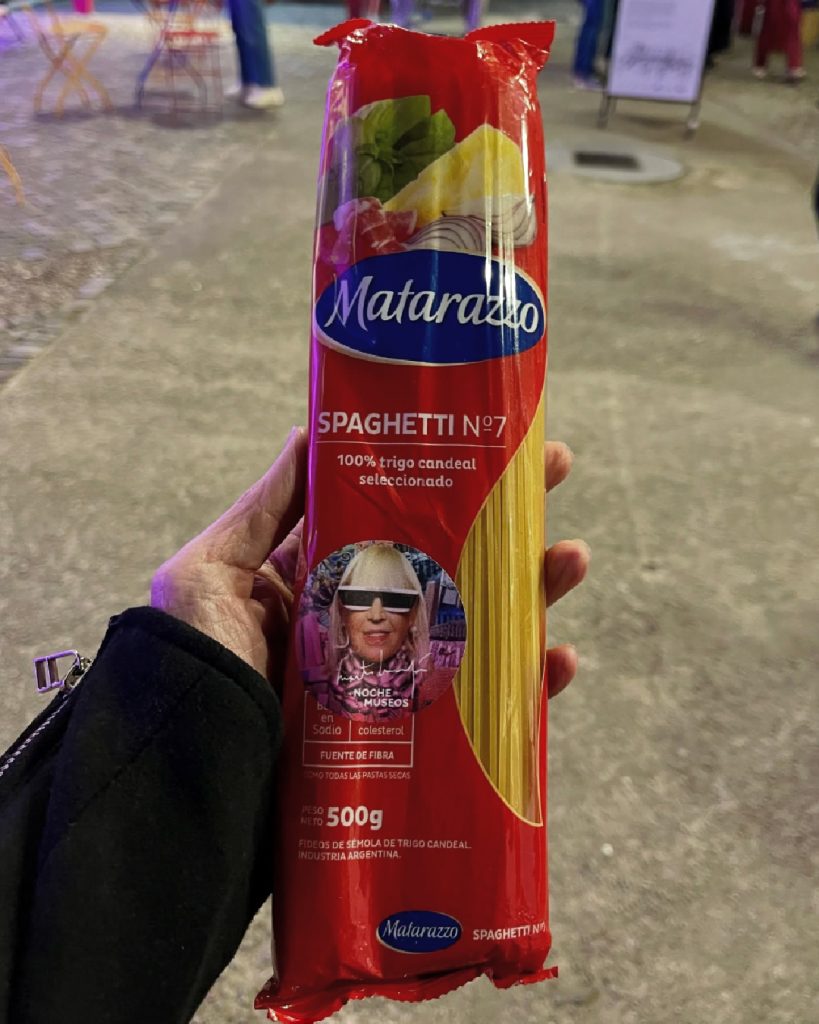 El público ingresaba por una pasarela central, y al final lo esperaban performers con la icónica cabellera rubia de la artista. Ellos entregaban paquetes de medio kilo de spaghettis, transformando la experiencia en un momento colectivo donde todos se llevaban algo.
