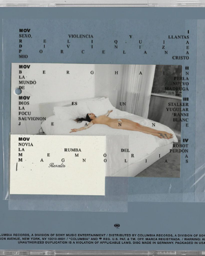 Y, como contrapunto, la contraportada. Una parodia visual: Rosalía desnuda, en forma de cruz, bajo una etiqueta de contenido explícito. Una provocación que grita: voy a hablar de todo lo que no se nombra.