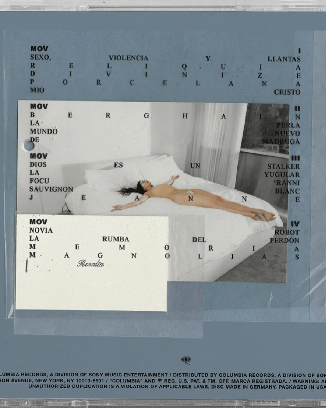 Y, como contrapunto, la contraportada. Una parodia visual: Rosalía desnuda, en forma de cruz, bajo una etiqueta de contenido explícito. Una provocación que grita: voy a hablar de todo lo que no se nombra.